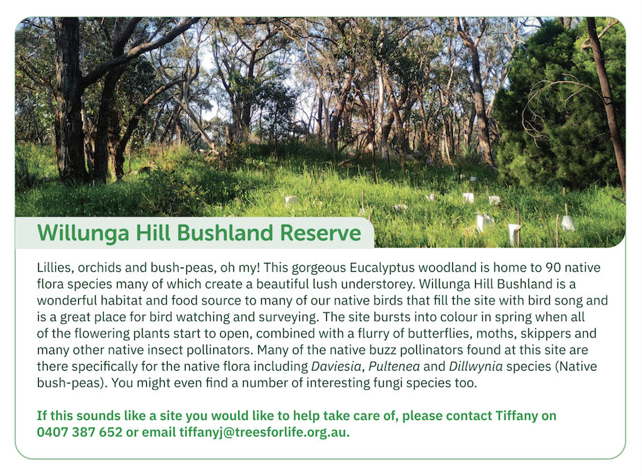 “Bushland sites help keep native habitats healthy to continue to provide homes for animals and a functioning ecosystem for pollinators and, importantly, a place for us to reconnect with the earth for our wellbeing,” says Trees For Life CEO Natasha Davis.