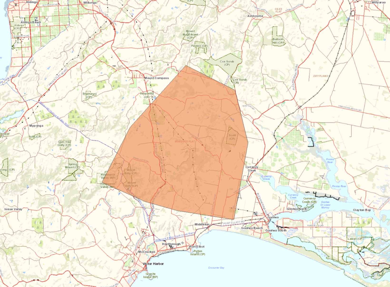 Nangkita, Mount Jagged, Mosquito Hill, Mount Billy Conservation Park, and Scott Creek Conservation Park, east of Mount Compass.