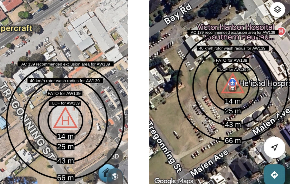 Photographs demonstrating proximity risks and clearance constraints for the original ‘Rotary’ site and the same for the newly constructed helipad site.Concerns have been raised over the newly built helipad at Victor Harbor Hospital, which remains out of service due to non-compliance with national safety standards.