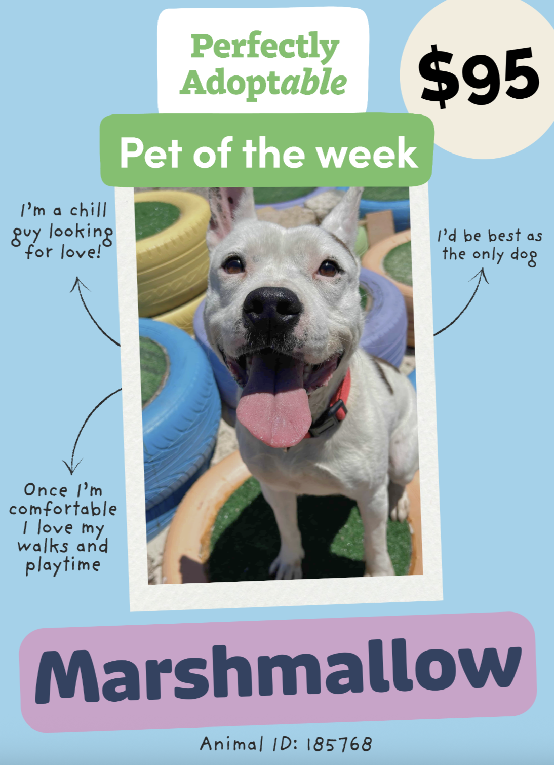 This week’s Pet of the Week is the beautiful-natured Marshmallow, a sweet and affectionate boy who is ready to find his forever home.