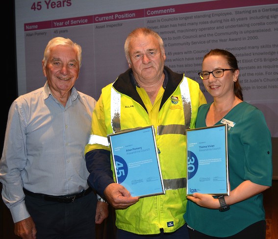 Alexandrina Mayor Keith Parkes with long-serving Alexandrina Council employees Allan Pomery and Thelma Vivian.Alexandrina Council presented Local Government Service Awards to 21 employees last week, including its longest-serving employee, Allan Pomery, who has worked for the council for 45 years.