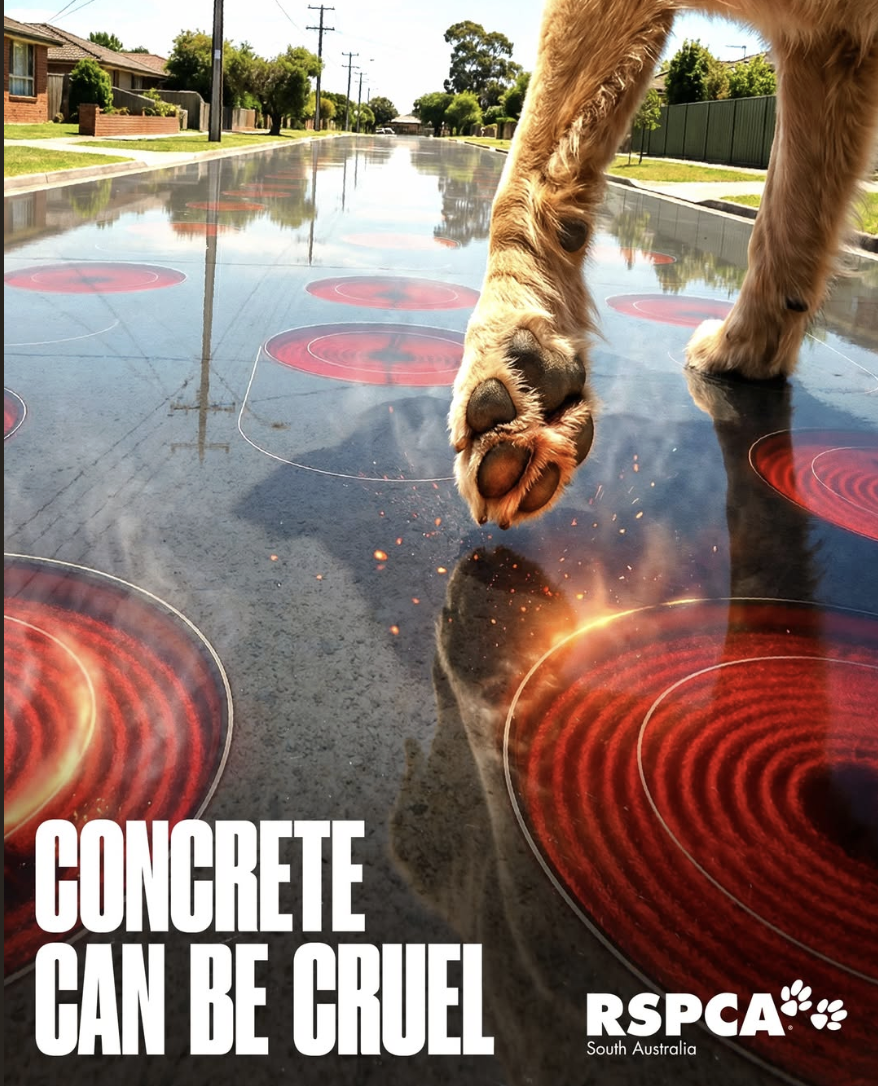 Concrete can be cruel - RSPCA facebookWith temperatures forecast to soar above 40°C across South Australia this long weekend, RSPCA South Australia is urging pet owners to take extra care to keep animals safe during the extreme heat.